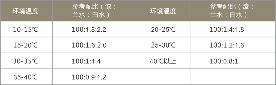 在實(shí)際施工中可根據(jù)實(shí)際情況參考以下配比,相對(duì)濕度在75%以下時(shí),配漆為: